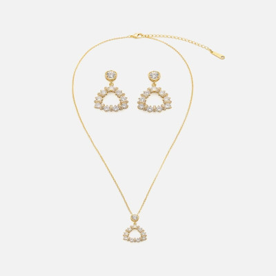 طقم اكسسوارات نسائي باللون الذهبي الذي يعكس الفخامة والأناقة. يتكون الطقم من سلسال وحلق بتصميم مميز مزخرف بفصوص من الزركون اللامع وحلية لؤلؤة تتدلى منه.