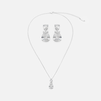 طقم فضي أنيق يتكون من سلسال وحلق بتصميم مميز يعكس الرقي والفخامة. يتزين الطقم بحلية على شكل قطرة مزخرفة بحجر من الزركون اللامع، ما يضيف لمسة أنثوية رائعة لإطلالتك. الطقم المثالي لإضفاء لمسة من الجمال على مظهرك أو كهدية مميزة لشخص عزيز.
